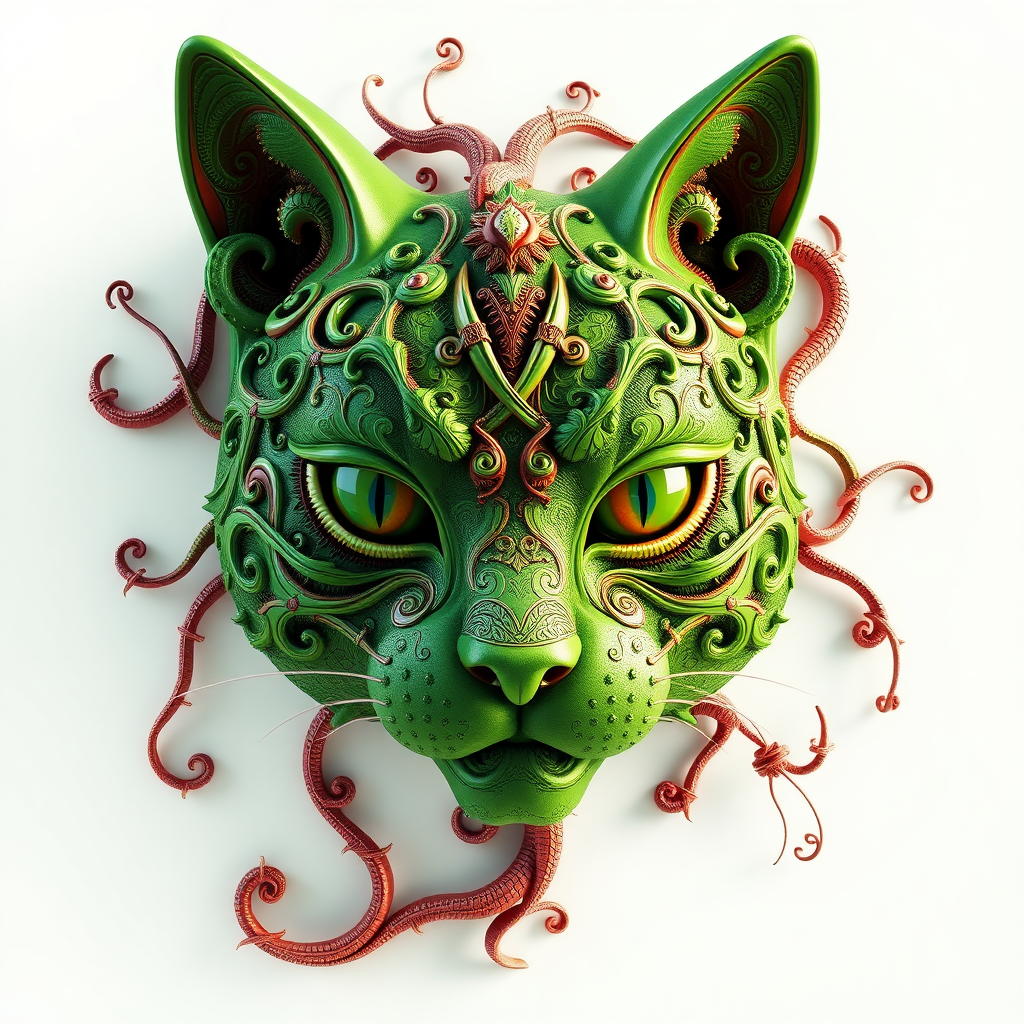 A stunning, intricately detailed, and ornately decorative 3D sculpture of a green cat face mask, enhanced with twisting vines and an array of tiny, delicate lines. The abstract, psychedelic design features vibrant colors that flow seamlessly, offering an 8K resolution close-up reminiscent of an artstation masterpiece.