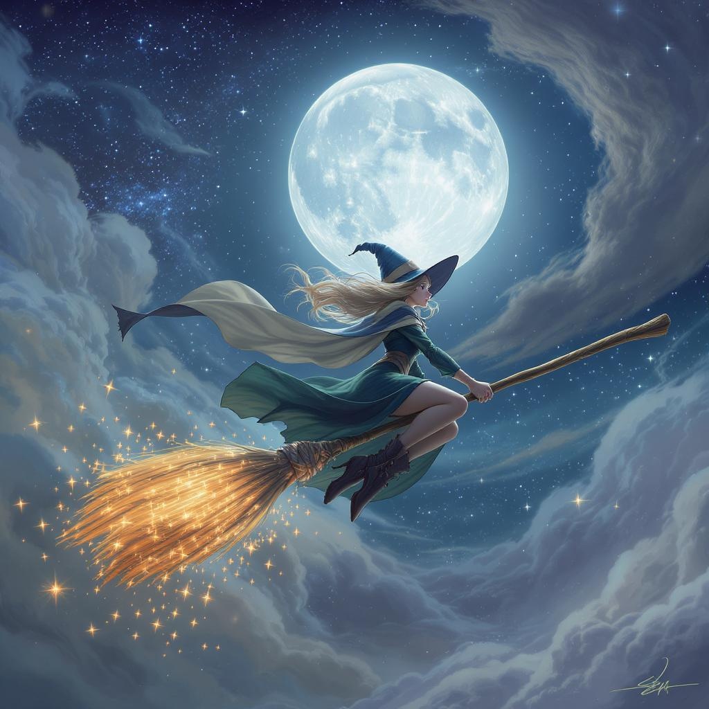 A stunning, intricately detailed illustration of a young woman soaring through the fantastical night sky on a broomstick. The scene is set outdoors under a bright, full moon surrounded by twinkling stars and wispy clouds. Her hair and cape flutter energetically in the wind, embodying a sense of freedom and adventure. She wears a pointed hat and elegant boots, exuding an aura of mystery and enchantment. The broomstick glows with magical energy, highlighting her prowess in spellcasting. The composition is rich with imaginative elements, capturing the whimsical essence of fairy tales and folklore. The foreground, middle ground, and background seamlessly blend to create a dynamic sense of movement and speed, emphasized by naturalistic realism and vibrant colors. This enchanting representation delves into the beauty of fantasy culture, mythology, and the allure of magical worlds, incorporating mythical creatures and legendary wizards. The light and texture add dimension to the scene, evoking a profound sense of wonder and determination.