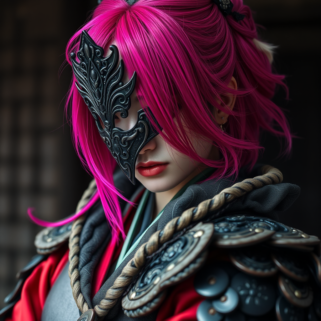 A stunning Japanese kunoichi with vibrant magenta hair cascading down her shoulders, her face partially obscured by an intricately designed mask. She dons thick, intricately detailed hide armor that perfectly balances elegance and toughness, showcasing an expressive style. The scene captures hyperrealistic, photorealistic quality, akin to an 8k visual, as if rendered within a cutting-edge graphics engine. The composition reveals an intriguing mix of traditional and modern elements, with a captivating blend of mystery and grace.