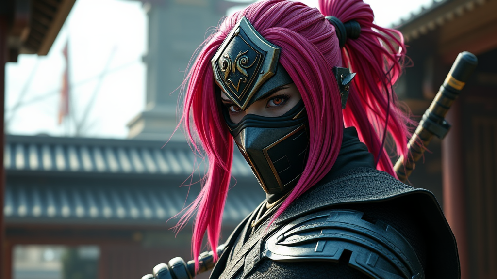 A stunning Japanese ninja featuring vibrant magenta hair, wearing an elegantly crafted mask and sleek, thick hide armor, rendered in hyperrealistic detail with photorealistic qualities. Captured in 8k resolution, utilizing the power of Unreal Engine with a 9:16 aspect ratio, the scene is brought to life in an expressive style. The environment blends traditional and modern elements, showcasing subtle hints of an ancient Japanese backdrop mixed with futuristic accents, adding an intriguing depth to the visual narrative. The shadows and lighting are meticulously crafted, highlighting the textures and colors of the character and surroundings, creating an immersive and captivating image.