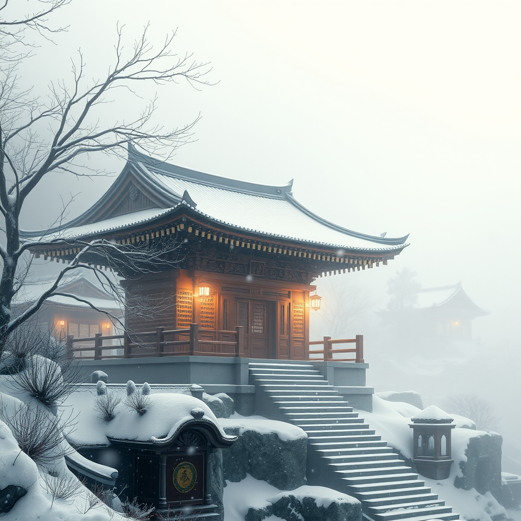 A stunning Japanese shrine nestled in a serene, snowy landscape, evoking a dreamy and ethereal atmosphere, inspired by the art of Tsukioka Yoshitoshi and Studio Ghibli. The scene is softly veiled by volumetric fog, adhering to the rule of thirds composition, with intricate details and dramatic cinematic lighting, captured in a 4K, 50mm lens style. Subtle modifications introduce a gentle snowfall, adding to the sense of tranquility and wonder.