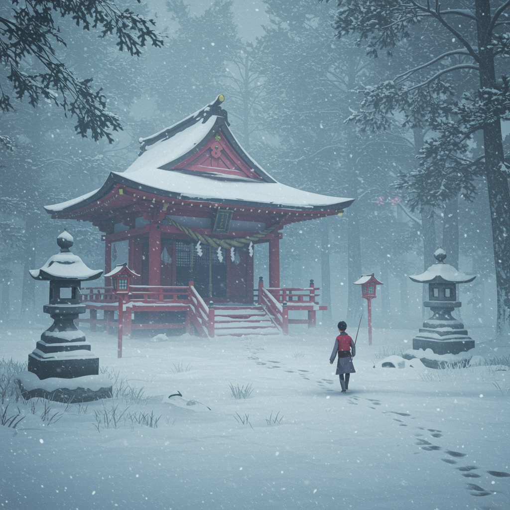 A stunning Japanese shrine nestled in a serene snow-covered landscape, evoking a dreamy and otherworldly atmosphere reminiscent of Tsukioka Yoshitoshi and Studio Ghibli. The scene is partially obscured by delicate volumetric fog, captured with a rule of thirds composition for a balanced view. The painting is rich with intricate details and dramatic cinematic lighting, reminiscent of a 4k, 50mm lens perspective. Amidst the ethereal setting, subtle creative elements add depth and intrigue, enhancing the mystique of the snowy nature scene.