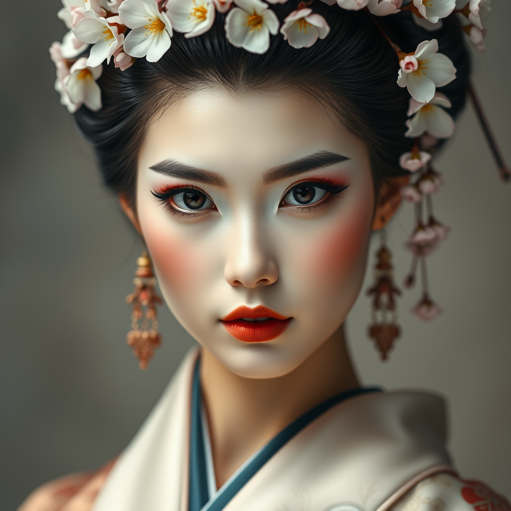 A stunning Japanese woman with porcelain skin exudes an ethereal allure; her monolid eyes are dark and mesmerizing, highlighted by intricate eyeliner that enhances her captivating gaze. Delicately arched eyebrows express gentle emotions, while her lips are subtly tinted in soft colors. She is gracefully adorned in a luxurious silk kimono, and her elaborate hairpiece, decorated with cherry blossoms, adds depth to her enchanting appearance.