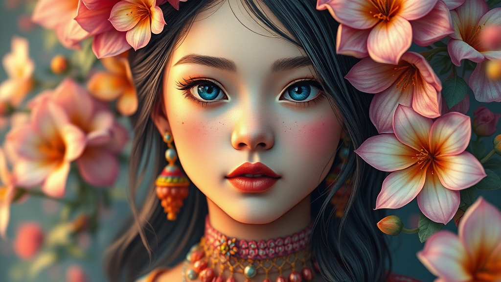 A stunning Javanese-inspired dream-like girl adorned with exquisite jewelry, featuring a freckled young face with enchanting firefly-like hair amidst vibrant flowers. The artwork is characterized by the signature styles of artists like Artgerm, WLOP, and Ilya Kuvshinov, trending on ArtStation, and reminiscent of design houses such as Chanel and Dior. The style also draws inspiration from the expressive techniques of Daniel F. Gerhartz, Akihiko Yoshida, Anna Dittmann, Tetsuya Nomura, and Tom Bagshaw, showcasing a colorful ink illustration. Her face exhibits symmetrical features and precise anatomy, enveloped in soft and warm lighting. The piece is hyper-detailed with sharp focus, intricate textures, and a captivating bokeh effect. Presented in ultra-high definition with HDR10 quality, the image captures a dreamlike essence in absurdly high resolution without distortions such as duplicates or mutations. The composition maintains clarity and excludes elements such as watermarks, logos, text, or anything else that might detract from its ethereal beauty.
