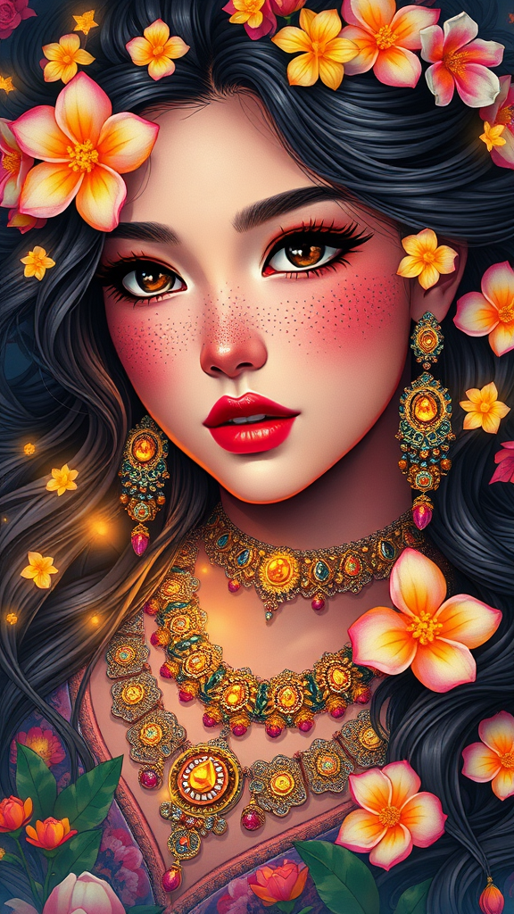 A stunning Javanese-inspired young woman with exquisite jewelry, her freckled face surrounded by flowing hair that resembles glowing fireflies, adorned with vibrant flowers. This character art is reminiscent of the styles of Artgerm, WLOP, and Ilya Kuvshinov, and is trending on ArtStation. The digital artwork blends influences from Chanel and Dior, with the painterly touch of Daniel F. Gerhartz and the elegance of Akihiko Yoshida, Anna Dittmann, Tetsuya Nomura, and Tom Bagshaw. Created with colorful ink, the illustration showcases symmetrical features and precise anatomy, enhanced by soft, warm lighting. The scene is hyper-detailed with sharp focus, intricate elements, and a bokeh effect, all captured in UHD quality. The image avoids disfigurement and emphasizes beauty without imperfections, resulting in a captivating and harmonious composition.