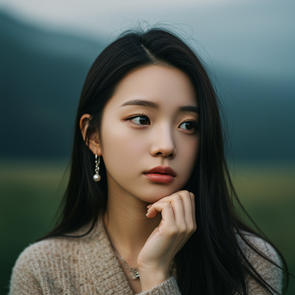 A stunning Korean girl gazing thoughtfully, surrounded by an immersive landscape, with an ethereal volumetric haze softly enveloping the scene. The global illumination highlights her features with a warm, natural glow. Captured in high detail, this RAW color photo presents a lifelike and realistic portrayal, rendered in ultra-high resolution. The background and textures are rich with nuances, exhibiting vivid colors and deep contrasts that accentuate the cinestill 800 film-like quality. Employing a f1.6 lens, the image showcases a meticulous hyper-realistic texture with a profound sense of realism, enhanced by the subtle play of physics-based rendering. The composition embodies hyperrealism and lifelike fidelity, creating a unified 8K wallpaper that captivates with its striking authenticity.