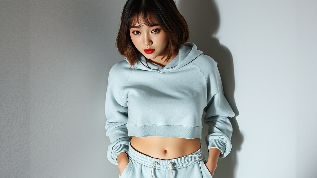 A stunning Korean girl with a stylish loose bob hairstyle, dressed in a chic cropped hoodie and fitted capri sweatpants. Her hands are casually tucked into her pockets, highlighting her toned figure and subtly drawing attention to her slender waist. Her lips are a striking shade of red, complementing her delicate features, while her long eyelashes and prominent aegyo sal accentuate her youthful charm. Captured in dramatic lighting that plays with shadows and highlights, this photograph beautifully showcases her natural elegance and modern style.