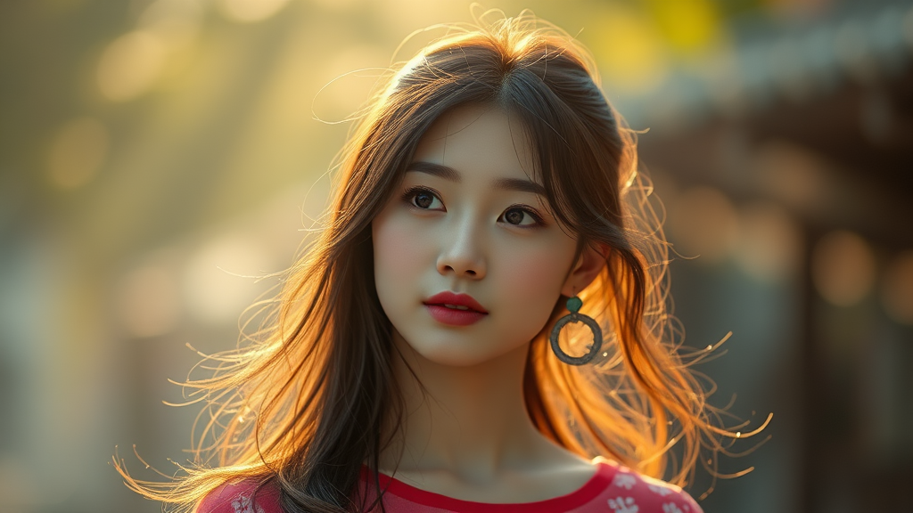 A stunning Korean girl with captivating beauty stands against a softly blurred background filled with volumetric haze and global illumination, captured in natural lighting. The scene is highly detailed, resembling a high-resolution CG image with realistic features and lifelike textures. The photo is taken with a powerful f1.6 lens to achieve rich colors and hyper-realistic detail, reminiscent of Cinestill 800 film. This cinematic and hyperrealistic image embodies the essence of realism and high contrast, perfect for ultra high resolution 8K wallpapers with physics-based rendering, showcasing the girl in vivid and lifelike clarity.