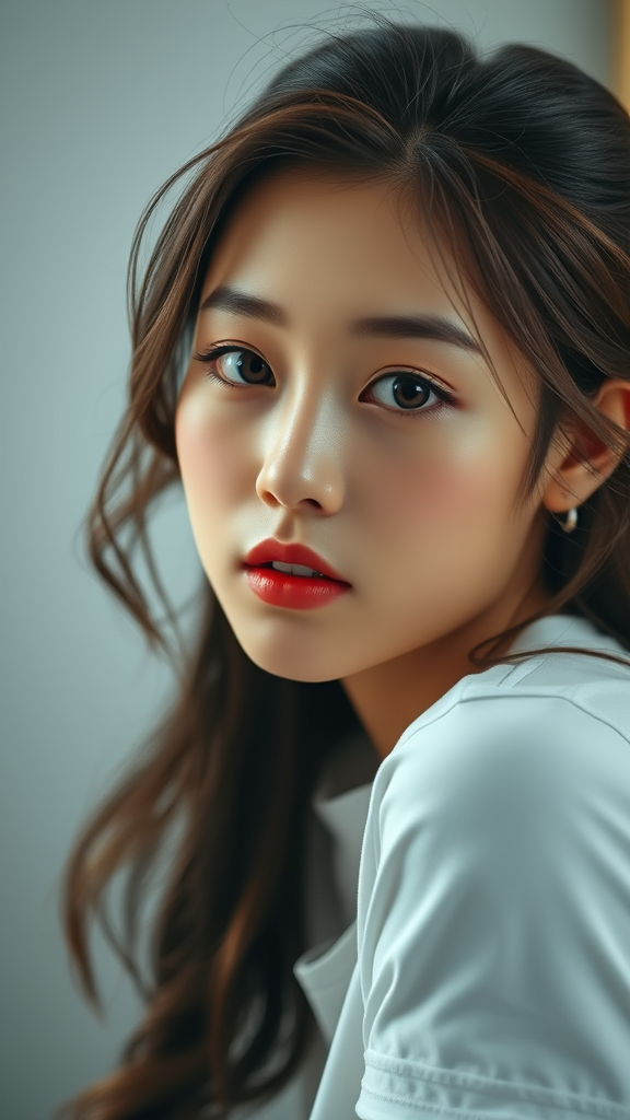 A stunning Korean girl with captivating eyes wears a white t-shirt, embodying the essence of a K-pop idol. This professional close-up portrays her in ultra-high resolution, capturing the exquisite details of her flawless skin and vibrant expression. The image is crafted in high detail, reminiscent of 8K wallpapers, featuring physics-based rendering and cinematic lighting for a photorealistic effect. Shot with precision using a Nikon D850 and Kodak Portra 400 film stock, the photo highlights rich colors and hyper-realistic textures, creating a masterpiece that celebrates realism. Enhanced by dramatic lighting and the influence of cinematic techniques, this lifelike portrait is both visually striking and intimate, capturing the elegance of its subject with artistry. Free of imperfections, the composition focuses on natural beauty and harmonious proportions.