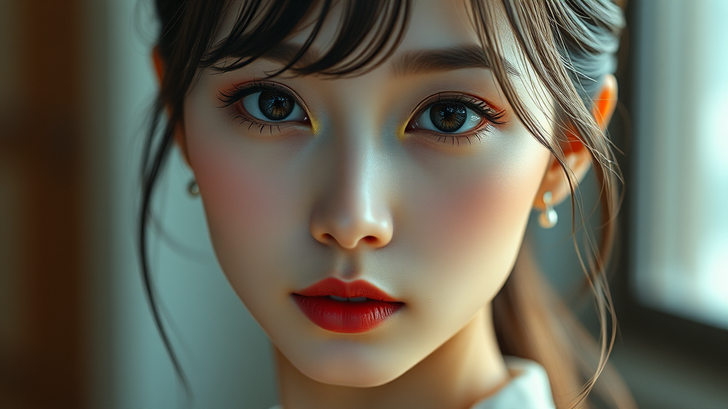 A stunning Korean girl with exquisite, symmetrical eyes is captured in dramatic lighting, revealing a meticulously detailed, lifelike visage. This high-resolution, realistic image evokes the essence of a professional photo, reminiscent of a high-end CGI creation. Using an f1.6 lens, the shot embodies rich, vibrant colors and hyper-realistic texture, creating a cinematically real portrait. Set against a unified 8K wallpaper backdrop, the scene employs physics-based rendering to enhance its photographic authenticity. Despite its digital nature, it embraces realism, with ultra-high resolution and a focus on perfect anatomy, excluding digital imperfections like extra limbs or mutations, maintaining a flawless depiction of beauty.