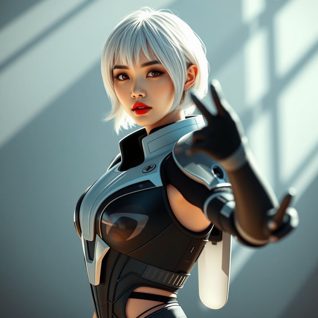 A stunning Korean woman, embodying the charisma of a K-pop idol, stands poised for action in a dynamic pose. She dons sleek Mass Effect-inspired armor, exuding a blend of futuristic technology and elegance. Her hair is a striking shade of white, styled in a cute loose bob that frames her face. Her red lips add a touch of boldness, complementing her subtle yet confident expression. Her physique is toned and athletic, showcasing her agility and strength. Dramatic lighting casts shadows that accentuate the intricate details of her armor and features. Captured in ultra-high resolution, the image uses physics-based rendering to create a realistic and immersive scene, enhancing the visual impact of this powerful and captivating character.