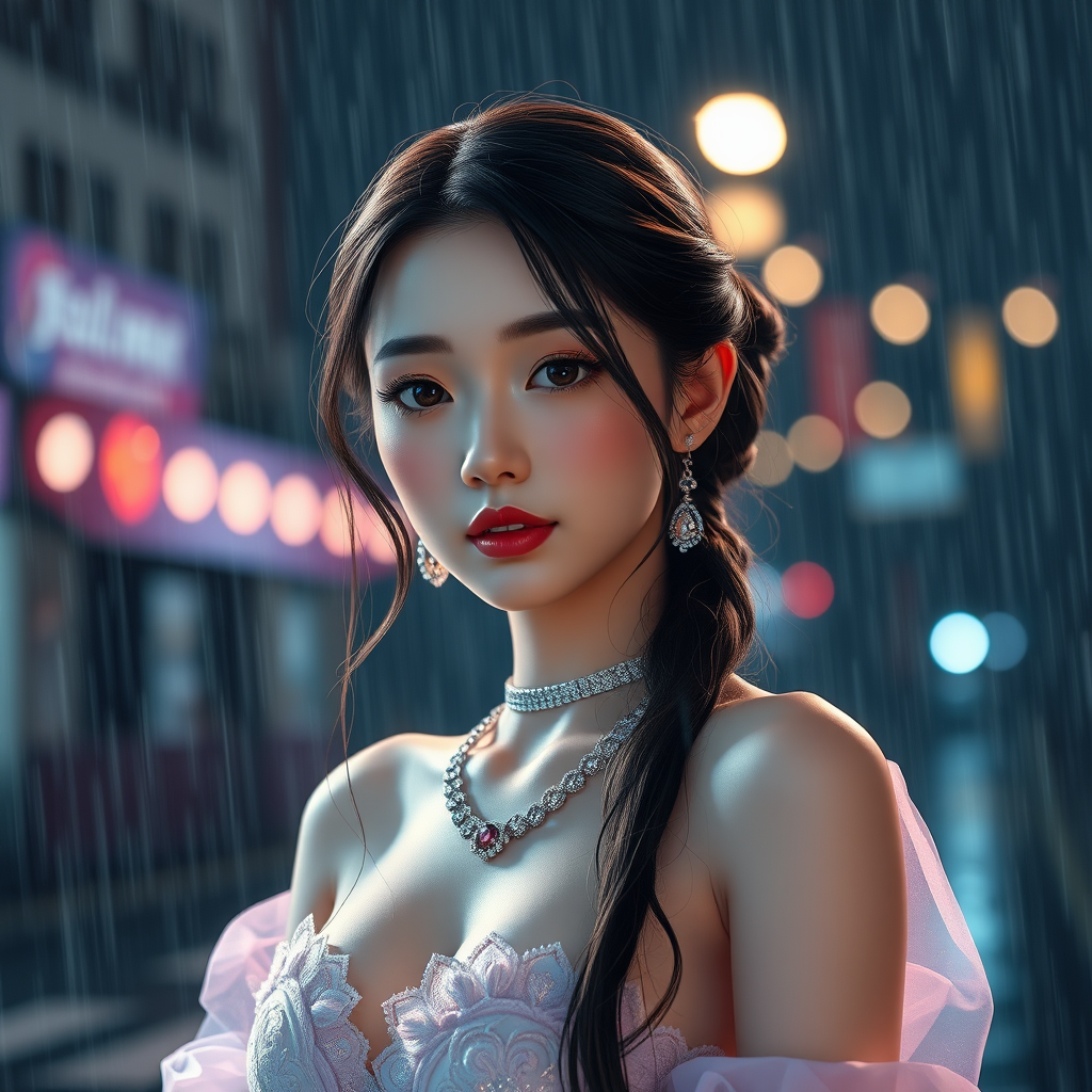 A stunning Korean woman, embodying the essence of a K-pop idol, stands gracefully under a dark and rainy night, highlighted by cinematic lighting. Her appearance is hyperrealistic and photorealistic, captured in ultra high-resolution 8k quality. She is adorned with exquisite photography jewelry, accentuating her elegant features. Her presence is a blend of CGI and 3D aesthetics, reminiscent of a beautifully crafted doll. The scene is rendered in octane, merging elements of cartoon and anime, seamlessly blending into an illustration that feels both like a digital painting and an artistic drawing.