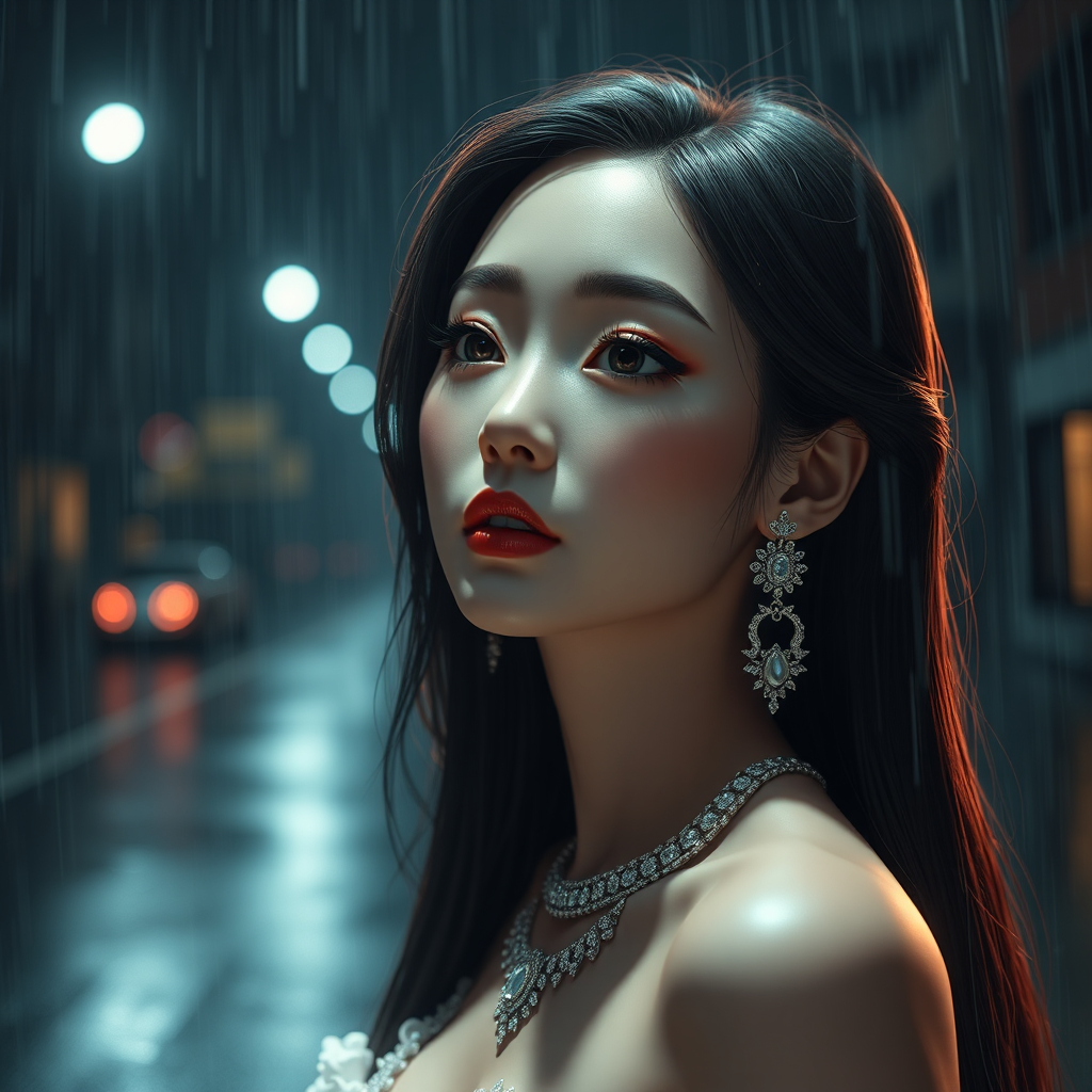 A stunning Korean woman, kpop idol, set against a dark and rainy night with cinematic lighting, showcasing hyperrealism in ultra high-resolution, photorealistic 8k photography. Adorned with exquisite jewelry, she exudes elegance. Her presence blends CGI and 3D elements, with a doll-like appearance enhanced by Octane rendering. The scene is animated with a mix of cartoon and anime influences, captured through a digital art style that combines illustration and painting. Although the art form leans towards high detail, elements of a low-resolution, text-like effect add a unique contrast.