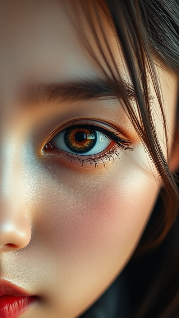 A stunning Korean woman, kpop idol, with symmetrical eyes depicted in ultra high-resolution photorealistic style. Captured through dramatic lighting and photography, utilizing physics-based rendering for the best quality. A high-detail RAW color professional close-up photo showcases her beautiful, intricately detailed eyes, offering a visually arresting image. Avoids CGI, 3D models, doll-like features, cartoons, anime, illustrations, drawings, digital art, sketches, low resolution, text, cropping, jpeg artifacts, unattractive elements, duplicates, poorly drawn features, deformities, blurring, logos, and disproportionate features.