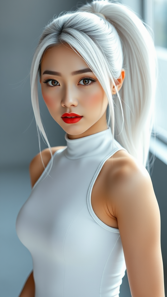 A stunning Korean woman resembling a K-pop idol, characterized by her striking white hair styled in a sleek ponytail and perfectly symmetrical eyes. She's dressed in a form-fitting, sleeveless all-white bodysuit that accentuates her petite frame, with her red lips providing a vivid contrast against her olive skin tone. Her expressive eyes are enhanced by long eyelashes and aegyo sal, giving a youthful appearance. Imagine capturing this scene using a Nikon D850 with a film-like quality, evoking the tones of Kodak Portra 400. The image is bathed in dramatic lighting, highlighting rich colors and intricate details with a cinestill 800 effect, shot at an aperture of f/1.6 for depth. This high-resolution CGI masterpiece combines elements of digital art and photography, presenting a realistic, ultra-detailed portrait that could grace a unified 8K wallpaper. The rendering is physics-based, offering a lifelike depiction that blurs the line between reality and art.