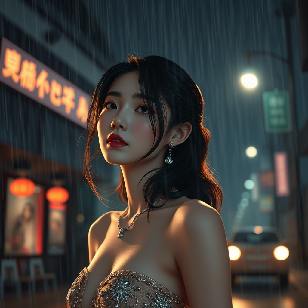 A stunning Korean woman, resembling a K-pop idol, stands under a dark and rainy night, illuminated by cinematic lighting. The scene is captured in hyperrealism, with ultra high-resolution, photorealistic detail, as if photographed in 8k. She wears elegant jewelry, her presence enhanced by CGI and 3D effects, giving her a doll-like appearance. The image blends elements of both cartoon and anime, achieved through digital art and painting techniques, resulting in a striking illustration with hints of low-resolution textures subtly woven into the background.