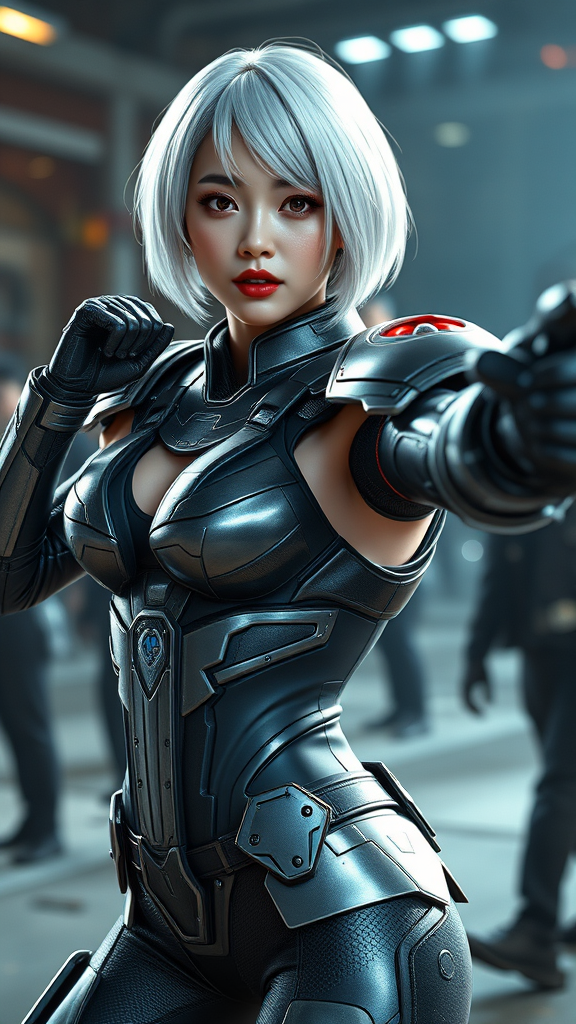 A stunning Korean woman, resembling a K-pop idol, strikes a dynamic pose in the midst of an action scene. She is clad in sleek Mass Effect armor that accentuates her toned physique and small bust. Her striking white hair, styled in a cute loose bob, frames her face perfectly and complements her vibrant red lips. The scene is brought to life with dramatic lighting that highlights the details of her armor and enhances her commanding presence. Rendered in ultra-high resolution with physics-based rendering, the image captures both beauty and strength, presenting a captivating juxtaposition of elegance and power in a futuristic setting.