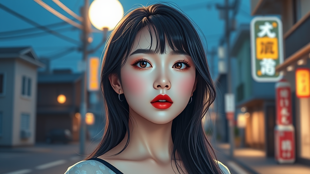 A stunning Korean woman resembling a K-pop idol, with perfectly symmetrical eyes and striking soft red lipstick, is standing on the corner of a street bathed in moonlight. The scene is captured in an ultra high resolution, hyperrealistic 8k photography style, blending elements of CGI and 3D render, with influences from cartoon, anime, and illustration. This digital painting exudes a dreamy, ethereal quality, showcasing a flawlessly drawn figure with exquisite attention to detail and perfect anatomy. The composition is balanced and harmonious, avoiding any distortions or imperfections, presenting a captivating and graceful presence in a moonlit setting.