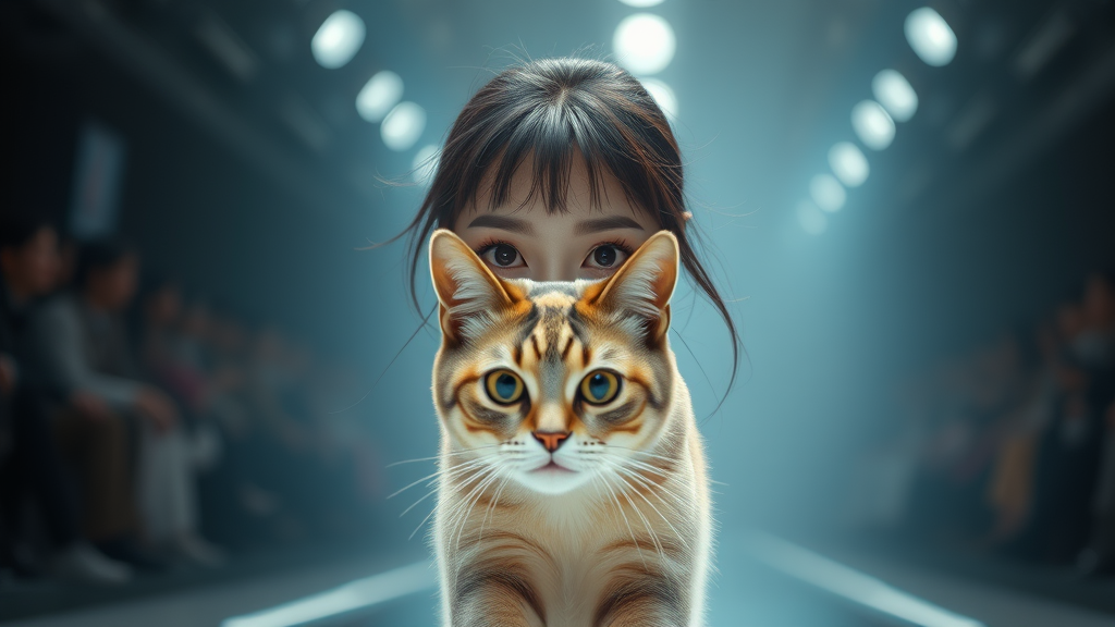 A stunning Korean woman, resembling a K-pop idol, with perfectly symmetrical eyes, captured in an ultra high-res, photorealistic 8k image. The setting features a cat elegantly walking down the runway, complemented by dramatic lighting at f/2.0. The scene combines elements of CGI, 3D art, and hyperrealism, evoking a sense of both a live model shoot and a digital masterpiece. The aesthetic blends a doll-like charm with influences from anime and digital illustration. Avoid aspects like cropped, low quality, and unwanted artifacts to maintain visual perfection, steering clear of errors in anatomy, additional limbs, or disfigured features, ensuring a flawless, lifelike representation.
