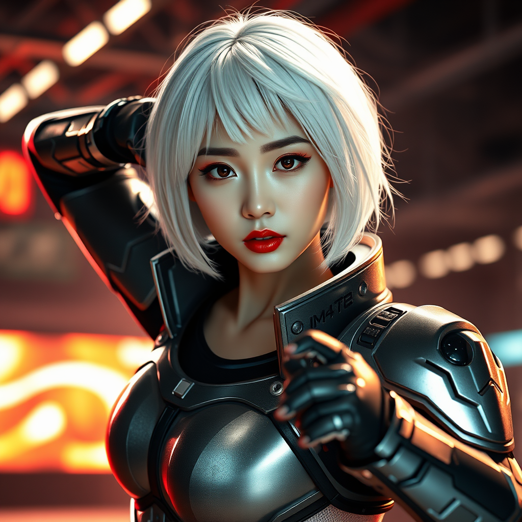 A stunning Korean woman strikes a dynamic pose in sleek, futuristic armor reminiscent of Mass Effect. Her vibrant white hair is styled in a cute loose bob, perfectly contrasting with her bold red lips. This energetic scene captures her as a K-pop idol with a fiercely toned physique, small breasts, and intense focus. The environment is enhanced by dramatic lighting, highlighting every detail in ultra-high resolution and rendered with realistic, physics-based effects. This captivating scenario blends the elegance of a pop star with the strength of a sci-fi warrior, creating a striking visual masterpiece.