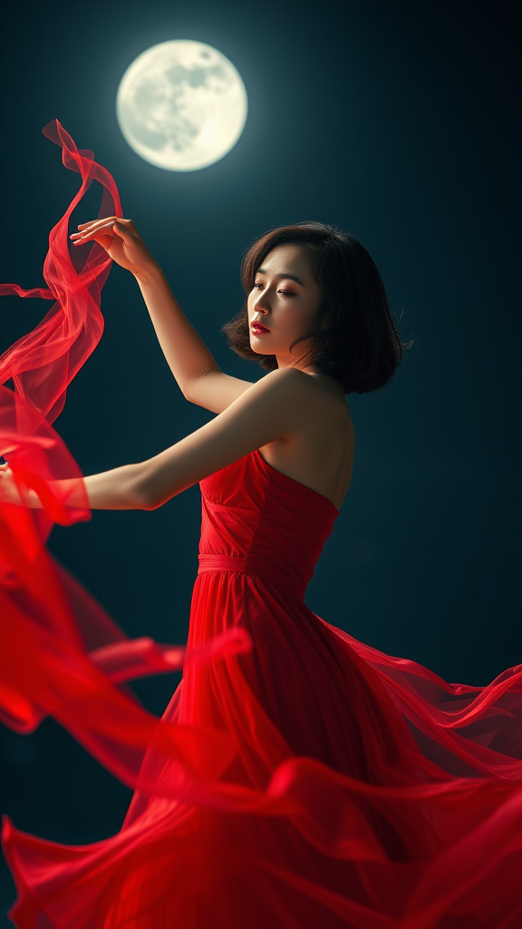 A stunning Korean woman with a charming loose bob hairstyle, elegantly clad in a mesmerizing red dress that seems to be crafted from ethereal red smoke, gracefully dancing beneath the moonlight. The scene captures ultra high-resolution, hyperrealistic details with vibrant, dramatic lighting, akin to a masterful piece of fine photography, showcasing the fluidity and beauty of her movements against the serene night sky, rendered in a breathtaking 8k resolution and an aspect ratio of 2:1.