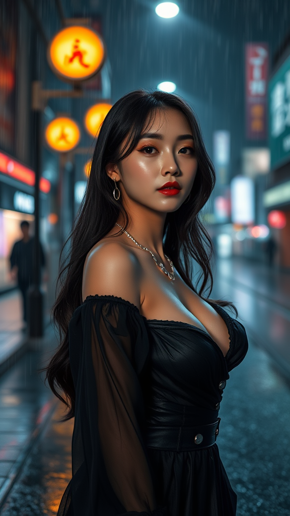 A stunning Korean woman with an idol-like presence, embodying the allure of K-pop, stands strikingly against the backdrop of a dark and rainy night. The scene is illuminated with cinematic lighting, capturing her in hyperrealistic detail. With ultra high-resolution, photorealistic quality, the image feels like an 8k photograph, highlighting her exquisite jewelry. Her voluptuous figure is reminiscent of a sophisticated CGI model, blending 3D realism with a doll-like charm. The environment, crafted with the precision of octane rendering, blurs the line between cartoon, anime, and reality. This illustration expertly combines digital art techniques, painting a vivid picture that balances hyperrealism and artistic abstraction, despite being rendered in a low resolution with subtle text elements.