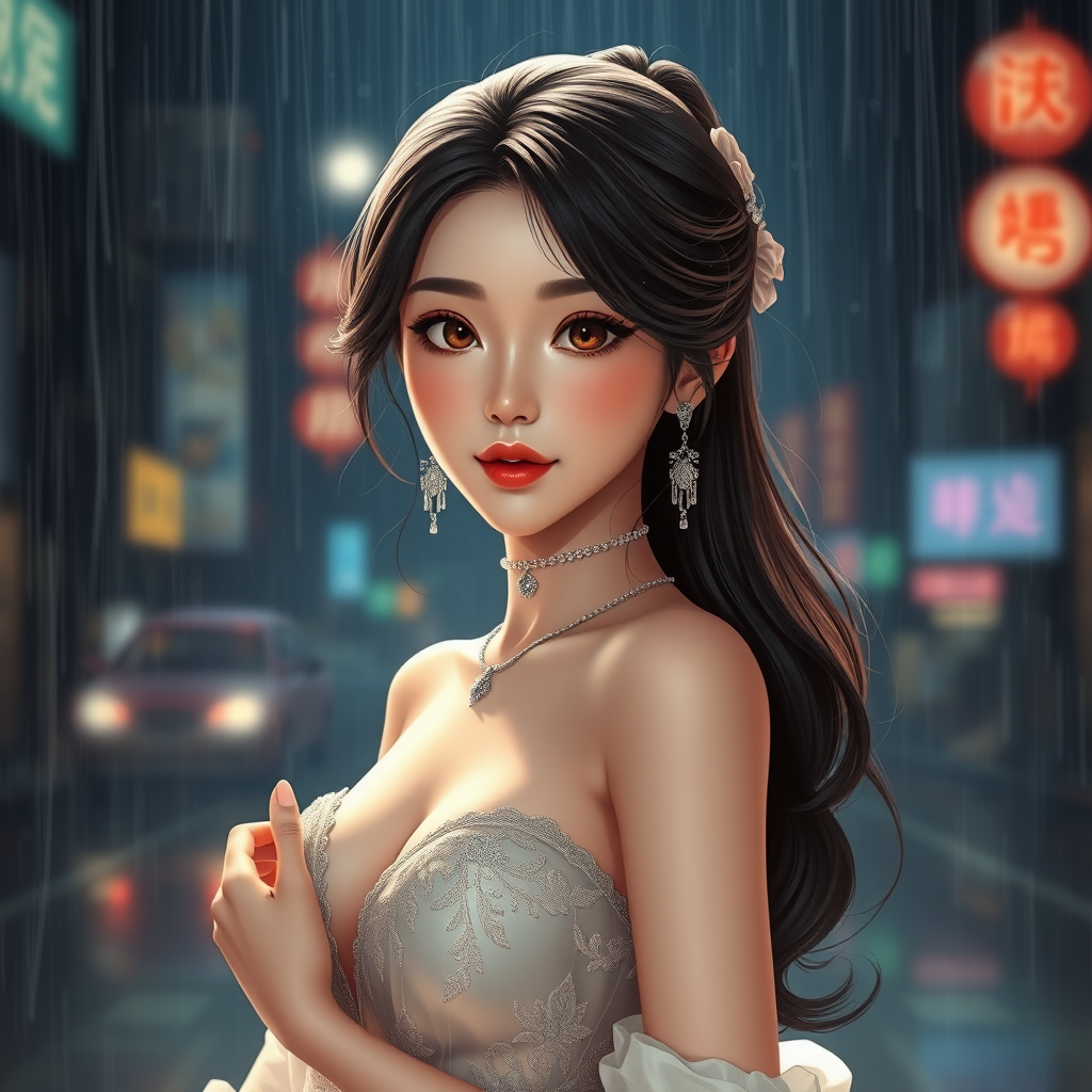 A stunning Korean woman with captivating beauty and the aura of a K-pop idol, standing against the backdrop of a dark and rainy night. The scene is illuminated by cinematic lighting, showcasing a hyperrealism style with ultra high resolution and photorealistic details. Her appearance is enhanced by exquisite jewelry, and her figure is accentuated with graceful confidence. A blend of CGI and 3D elements are seamlessly integrated, giving her a lifelike yet ethereal quality reminiscent of a finely crafted doll. This artwork merges cartoon and anime influences, captured through illustration, digital art, and digital painting techniques. The atmosphere is rich with texture and depth, evoking a vivid portrayal despite being rendered in low resolution with subtle text elements.