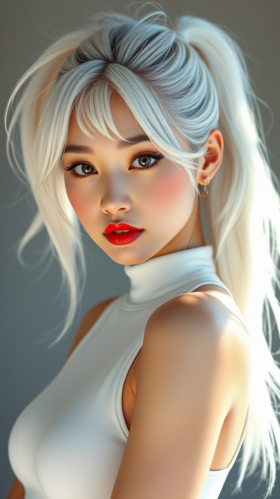 A stunning Korean woman with kpop idol allure, characterized by her striking white hair elegantly styled in a ponytail, and perfectly symmetrical eyes. She wears a sleek, all-white sleeveless bodysuit that contours to her form, complemented by bold red lips. Her complexion is a radiant olive, featuring delicate eyelashes and a subtle aegyo sal. Captured on a Nikon D850 film camera with a f1.6 lens, the photograph is rendered with rich, vibrant colors and dramatic lighting reminiscent of Kodak Portra 400. The image boasts 8K ultra-high resolution, delivering high-detail realism in a CG-inspired masterpiece, with physics-based rendering producing a photo-like quality. With professional-grade detail and high contrast, this illustration merges CGI and digital art elements for an anime-inspired, ultra-realistic portrait. Despite its complex composition, the image retains simplicity and elegance, ensuring clarity and visual impact, free from any imperfections or distortions.