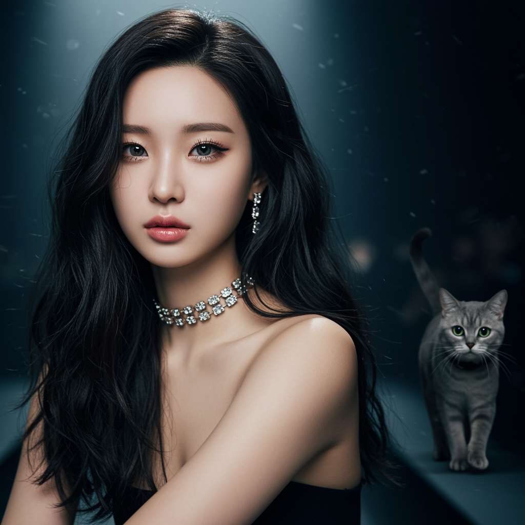 A stunning Korean woman with the allure of a K-pop idol graces the scene, her symmetrical eyes glistening in ultra high-resolution. The atmosphere is captured with photorealistic detail in 8k hyperrealism, enhanced by dramatic lighting reminiscent of a professional photography shoot. Meanwhile, a sleek cat struts confidently down the runway, embodying elegance with an f/2.0 cinematic depth of field. The visual scene unfolds with CGI artistry, blending 3D and doll-like features using state-of-the-art rendering. Integrating elements of cartoon, anime, illustration, and digital painting, the composition is vibrant and imaginative. Despite a visually striking presentation, it intentionally avoids errors such as cropping, low quality, or jpeg artifacts, embracing top-tier aesthetics devoid of flaws like mutation, distortion, or unrealistic anatomy, ensuring every detail is perfectly proportioned and exquisitely rendered.