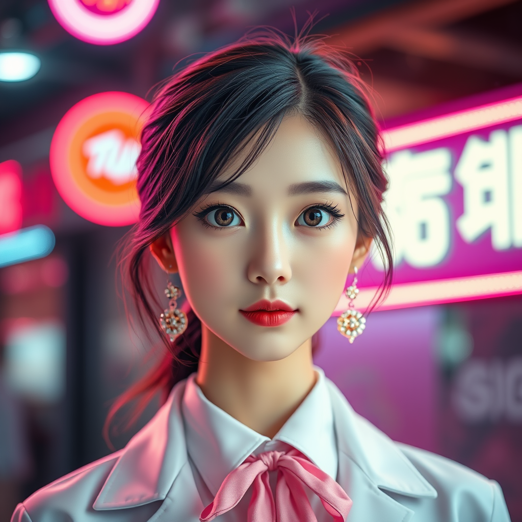 A stunning Korean woman with the elegance of a K-pop idol stands before a backdrop of vibrant pink neon lights. Her eyes are perfectly symmetrical and captivating, showcasing ultra high-resolution photorealism with a touch of hyperrealism that's brought to life by dramatic lighting and expert photography techniques. This high-detail RAW color photo captures her beauty with a professional close-up, emphasizing the intricate details of her radiant eyes and the delicate jewelry she wears. The composition blends elements of CGI and 3D rendering to achieve a doll-like, yet lifelike, quality. This scene evokes a sense of animated realism, where her features merge cartoon and anime aesthetics. The digital art and painting techniques applied here result in a visually striking portrayal, free of text, cropped elements, or artifacts. Her ensemble may echo professional accents like ties and buttons, though subtly integrated.
