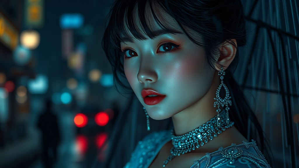 A stunning Korean woman with the elegance of a K-pop idol, captured on a dark and rainy night with cinematic lighting. The hyperrealistic, photorealistic 8k quality brings out the intricate details of her jewelry and attire. Her presence is both ethereal and captivating, reminiscent of high-end CGI and 3D rendering, yet with a touch of anime and doll-like charm. The artistry combines elements of digital painting and illustration, creating an enthralling blend of realism and fantasy.