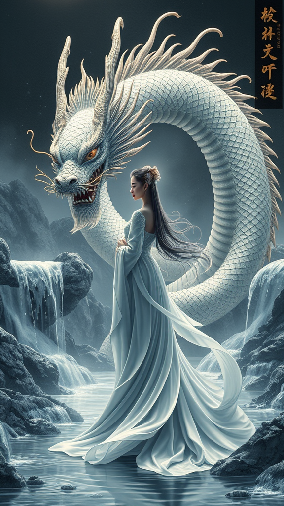 A stunning lady stands gracefully before an imposing dragon as water cascades around them, set against a mysterious backdrop. The scene is depicted in the intricate style of gongbi, with smooth and curved lines accentuating the elegance of the composition. Rendered with the realism and detail of Unreal Engine 5, the image captures an ethereal atmosphere. The lady's flowing garments ripple like water, echoing the surrounding streams, and the dragon's scales shimmer with an otherworldly glow, enhancing the sense of magic and wonder in the scene.
