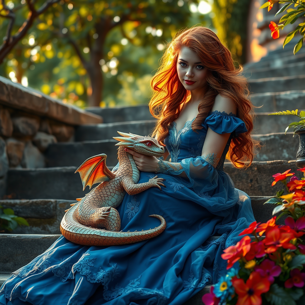 A stunning lady with flowing auburn hair sits gracefully on ancient stone stairs, an enchanting baby dragon curled beside her. The dragon's iridescent scales glimmer under the golden glow of sunset, casting delicate reflections on the lady's elegant blue gown. Her eyes, bright and full of wonder, gaze softly at the dragon, whose playful eyes mirror hers. The scene is captured in hyperrealism, with photorealistic detail highlighting the textures of the stone and the intricate embroidery of her dress. The setting is a mystical garden where vibrant flowers border the steps, adding bursts of color to the scene. The atmosphere is serene yet magical, as a gentle breeze rustles the leaves, adding life to this enchanting moment. 8k detail in a style that is both expressive and vividly immersive.