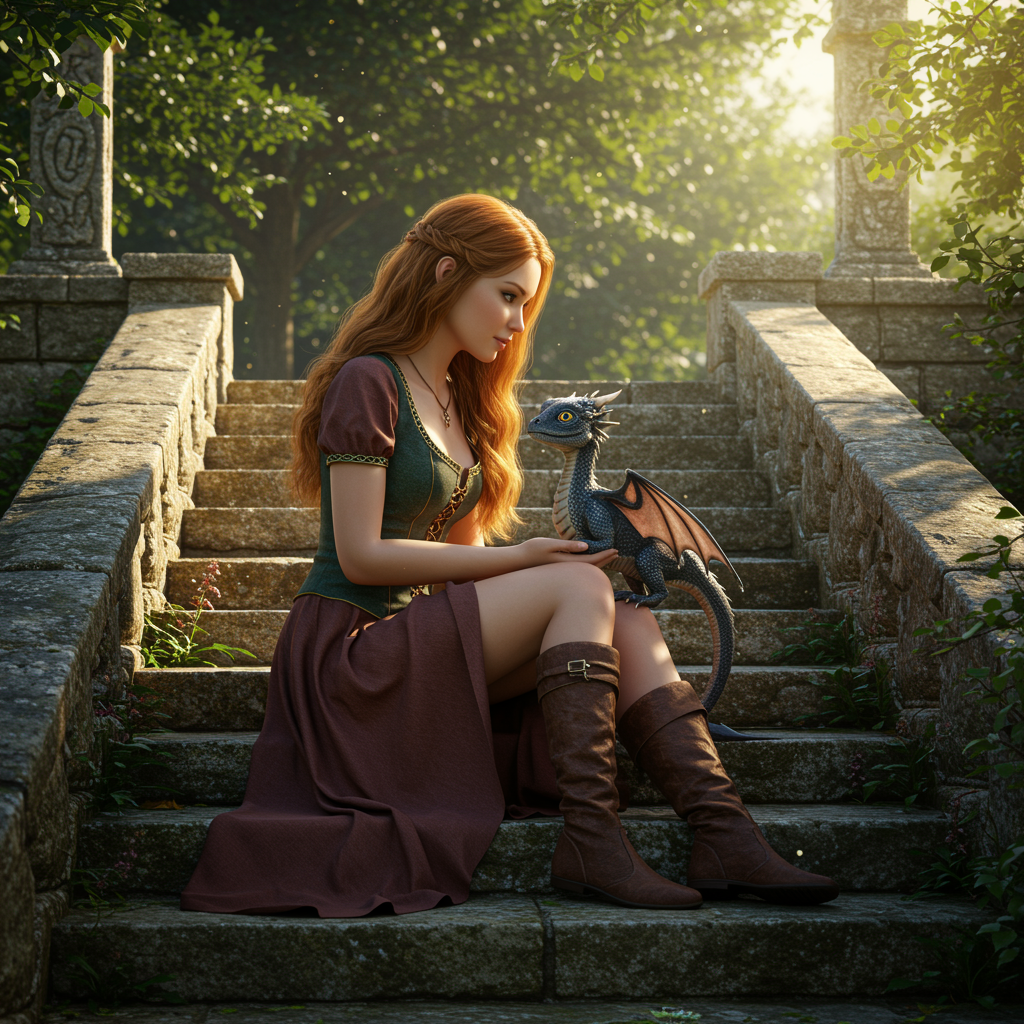 A stunning lady with flowing hair, dressed in elegant attire, sits gracefully on a stone staircase, a curious baby dragon nestled beside her. The scene is rendered in hyperrealistic detail, capturing the intricate textures of the stone and the dragon's shimmering scales. Sunlight filters through nearby trees, casting dappled shadows and creating a serene, magical atmosphere. The setting feels alive with vibrant color and expressive details, offering a photorealistic view that captures the tender bond between the lady and her mythical companion. The image is crafted in ultra-high definition, showcasing every nuance and emotive expression in 8k resolution, set within an enchanting fantasy world.