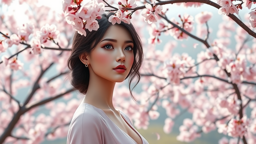 A stunning landscape of cherry blossoms with delicate pink flowers creating a sense of tranquility and beauty. The scene is serene and peaceful, providing a beautiful contrast to the vibrant beauty of a woman in the foreground. The woman is designed with a polished CGI aesthetic, emphasizing a 3D doll-like appearance with precise rendering. Her elegant figure and serene expression complement the ethereal setting. The cherry blossoms, in full bloom, shower the landscape with soft petals, and the branches create an intricate canopy above. The scene captures a harmonious blend of natural beauty and artistic representation, evoking a sense of calm and wonder.
