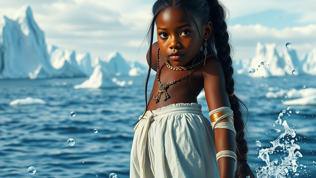A stunning, lifelike depiction featuring a beautifully toned girl with dark skin and a long braid, reminiscent of Katara. Adorned with intricate jewelry and bandages, she stands confidently, making direct eye contact. Her upper body is elegantly poised against a breathtaking backdrop of icebergs and the serene arctic sea. She is wearing loose, white baggy pants. The scene captures her waterbending prowess as bubbles of water float around her, highlighting the detailed artistry and capturing a sense of fluid motion and mastery.