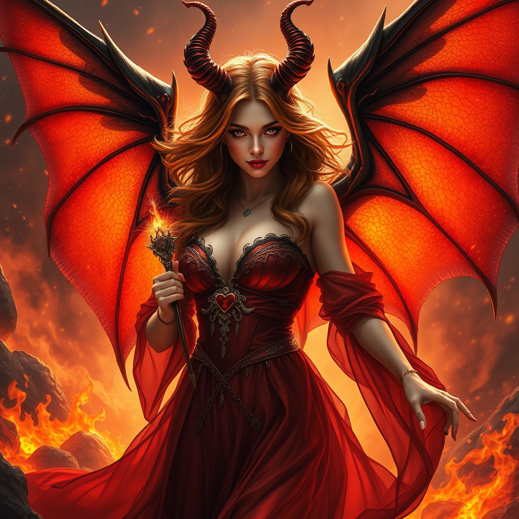 A stunning lifelike depiction of a female succubus with striking batwings and fiery, flowing hair, emerges from a scene of fire and magma. Her highly detailed face captures the essence of fantasy and magic, encapsulating the dreamy allure of Dungeons & Dragons. Enveloped in vibrant, fiery hues, she floats effortlessly, surrounded by mesmerizing particle effects. The wide-angle view showcases a meticulously detailed background, enriched with photorealism and crisp 8k clarity. Influenced by the artistic styles of Artgerm, Greg Rutkowski, Alphonse Mucha, Loish, and WLOP, the image is a masterpiece suitable for a professional digital painting featured on platforms like ArtStation and trending on Tumblr. Clad in a captivating gown, she elegantly holds an ornate wand, her expression a mix of mystery and allure. With perfectly balanced proportions and a commanding presence, she stands amidst a dynamic scene, with subtle nods to fantasy charm, ensuring an immersive, visually compelling experience.