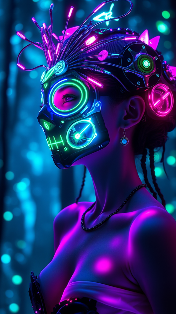 A stunning long-shot full body portrait of a woman, exuding a sense of lucid weirdcore and cybercore, gazing thoughtfully into the distance. Her skin is adorned with intense glowing biomechanical rips, styled in an intricate and insanely detailed marginalia headdress that captures the eye. Her appearance is strikingly gorgeous, accentuated by a mask crafted from fibre-optics, with bright neon lights shining in a vivid spectrum of colors including blue, green, and purple. She stands in a glowing forest, a vivid neon wonderland filled with dreamlike particles in hues of blue, green, and purple. The scene employs the rule of thirds and the golden ratio to create a photorealistic composition, featuring raytraced shadows and depth of field for emphasis. The asymmetric arrangement enhances the hypermaximalist aesthetic, capturing insane details rendered with octane precision. The cinematic realism is further heightened using the power of the unreal engine in 8k resolution, encapsulating the ethereal and otherworldly atmosphere in a 9:16 aspect ratio, delivering a mesmerizing visual narrative.