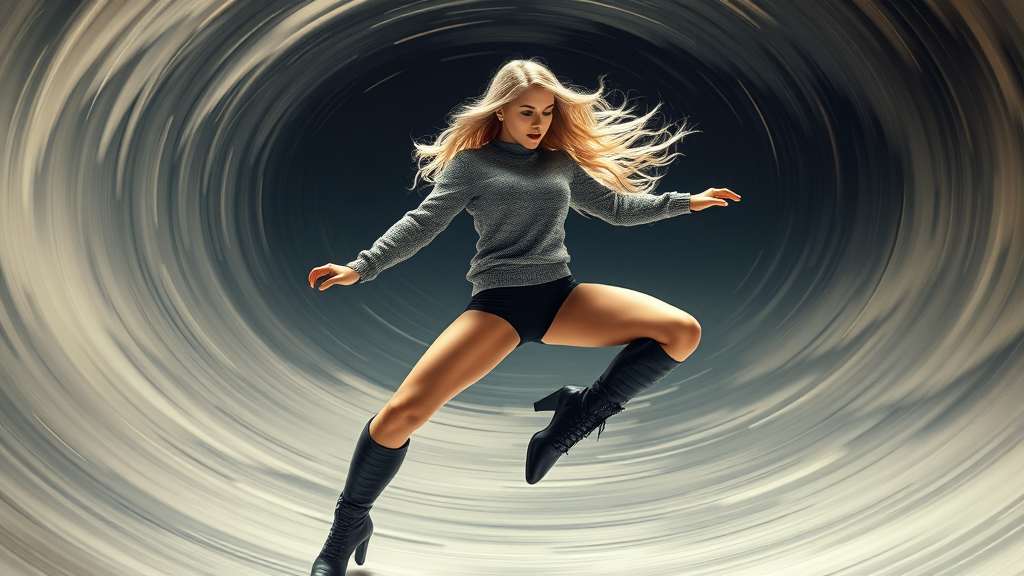 A stunning masterpiece capturing the essence of a superhero with blonde hair cascading around her, clad in a grey sweater and a sleek black leotard. She stands solo, her bare legs giving her the freedom to move effortlessly, as she twirls and spins with incredible speed. Her dynamic movements create a whirlwind effect, almost as if she's spinning into a tornado, with wind swirling around her. The powerful spin seems to transcend time itself, as if she's traveling through different eras. Her high boots add a touch of fierce elegance, completing the image of a heroine in motion, defying the boundaries of time and space.