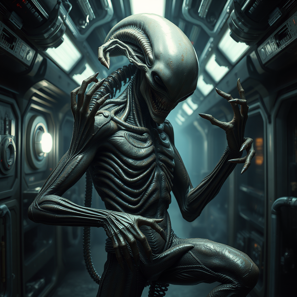 A stunning masterpiece depicting a hauntingly eerie alien creature adorned in alien skin and clothing, set against the backdrop of a damp, steamy, and intricately detailed spaceship corridor. The scene is enveloped in an atmospheric sci-fi ambiance, with flickering halogen lamps casting muted dark tones. The alien poses aggressively yet alluringly, showcasing a meticulously crafted full body and face, with intricate details like alien tattoos and scars adorning its refined, oil-greased skin. The skin glistens with reflective textures and dripping water, reminiscent of the iconic Alien film franchise. This photorealistic work exemplifies hyperrealism and analog style, captured in 8K UHD and RAW, with octane-rendered, professionally color-graded visuals featuring a muted LUT. The design is inspired by the artistic flair of HR Giger, Aaron Horkey, and Jeremy Mann, presenting a beautifully grotesque portrayal marked by anomalies like stacked torsos and mutative traits, enhancing its otherworldly allure.