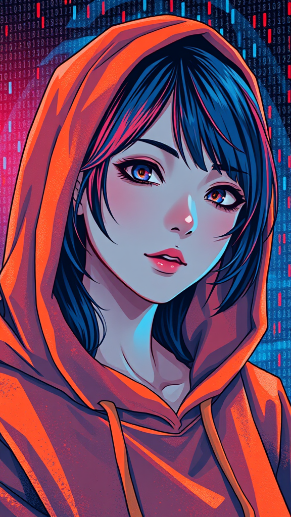A stunning masterpiece depicting a surreal and highly detailed anime portrait of a young woman. She is wearing a hoodie, elegantly crafted with hard brush strokes, and the composition is infused with an orange and blue color palette. The image features a mesmerizing binary code effect, seamlessly blended with a painterly style and heavy inking. With saturated colors highlighting red and blue hues, the artwork presents dynamic lighting and epic proportions. The background incorporates an intricate hypercube design, enhanced with a captivating pixelsort effect, creating an epic, pixel-rich composition. This visually striking piece could be found featured on platforms like Pixiv, boasting high-definition quality.