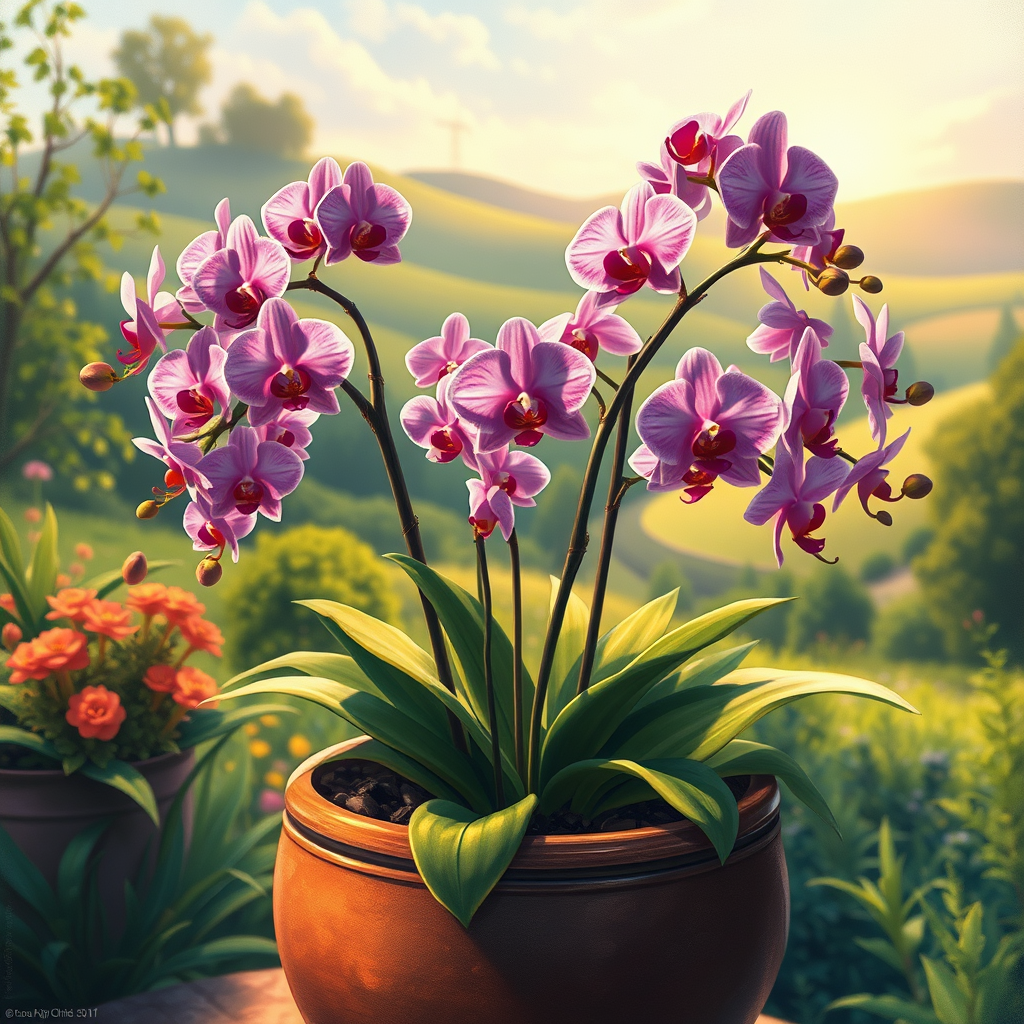 A stunning masterpiece depicts a flower pot brimming with vibrant orchids, set in a lush, enchanting outdoor scene. The scene captures the essence of Studio Ghibli's whimsical style, with a focus on the rule of thirds for a harmonious composition. The painting features highly detailed orchids with delicate petals in full bloom, basking in the warm glow of a tranquil afternoon. In the background, a serene landscape unfolds, with rolling hills and a gentle breeze rustling through the trees, painting an idyllic picture. This cinematic work of art features ultra-high resolution, bringing every intricate detail to life, while subtly incorporating the playful charm of a world where nature and fantasy intertwine.