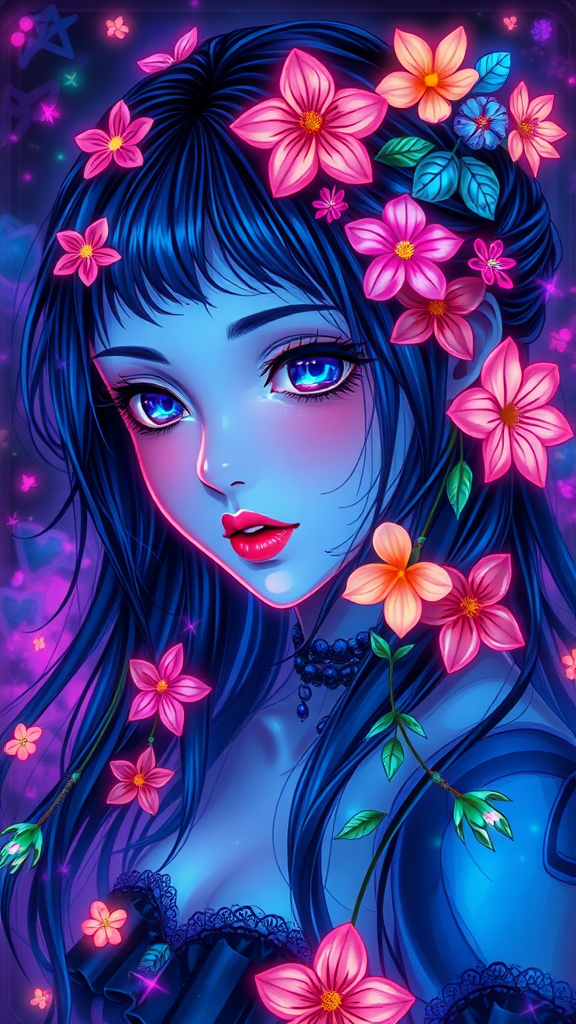 A stunning masterpiece featuring a centered drawing of a girl adorned with vibrant flowers woven into her hair, rendered in a captivating anime style. The artwork embodies gothic elements with a mesmerizing neon blacklight color scheme, radiating multicolored, shiny hues. The subject is a beautiful female android, exuding an ethereal allure through a predominantly blue palette, with living flora intricately entwined. The image is exquisitely antialiased, offering a smooth and polished finish. The character design is featured on popular art platforms, combining gothic art with futuristic elegance, resulting in an enchanting and colorful visual experience.