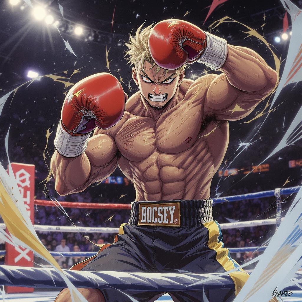 A stunning masterpiece featuring a dynamic scene of a man in a boxing ring, captured in a powerful anime-style illustration. The piece showcases a hyper-detailed depiction, reminiscent of trending art on Artstation, drawing inspiration from the styles of Jazza, RossDraws, and Kawacy. The man, with a commanding presence and a powerful chin, is mid-punch, exuding strength and agility. The artwork bears elements suitable for a card game illustration while also serving impeccably as a striking profile picture. Influence from Sachin Teng and an anime-style Will Smith adds unique flair, blending realism and stylized anime aesthetics.