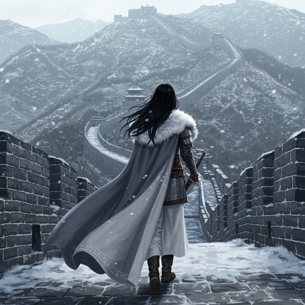 A stunning masterpiece featuring a lone woman with flowing black hair, clad in intricately detailed armor accentuating her figure, complemented by elegant white linen garments. A grand, majestic cape flows behind her, with a luxurious, textured fur coat edging its length. Bathed in the cool daylight, her presence exudes strength and grace. The scene is set against the awe-inspiring backdrop of The Great Wall, enveloped in a serene snowy landscape that adds a touch of ethereal beauty to the composition.