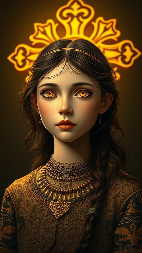 A stunning masterpiece featuring a single girl with exquisitely detailed face and eyes, and intricate clothing. Her eyes are shaped like golden symbols, adding an ethereal quality. In the background, a radiant golden holy cross illuminates the scene, accentuated by dramatic side lighting. The artwork is inspired by Alphonse Mucha's style, rendering in UHD, HDR, 8K for exceptional visual clarity. Details are meticulously crafted to capture beauty and elegance, ensuring a flawless and captivating image. No flaws, distortions, or visual distractions are present, creating a seamless and captivating portrayal.