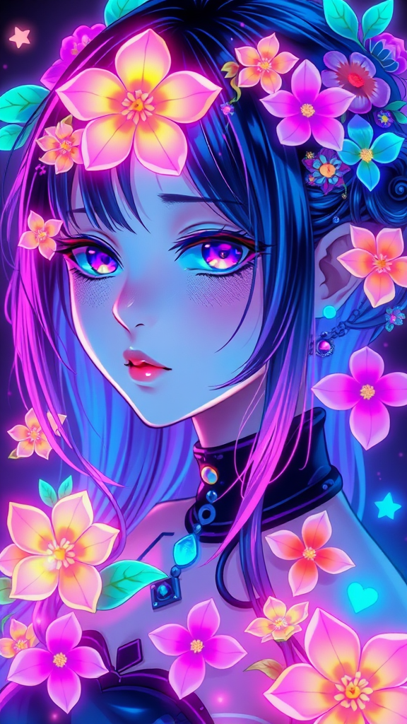 A stunning masterpiece featuring a young girl with vibrant flowers woven into her hair, embodying a unique blend of gothic and anime aesthetics. This artwork, perfect for a gallery on a platform like Pixiv, showcases a beautiful female android with a captivating design. The illustration is brought to life with a neon blacklight color scheme, boasting shiny, multicolored hues that illuminate the character's features. Her skin glows with a radiant blue tint, while the living flora around her pulsates with vivid colors. The image is meticulously antialiased, ensuring smooth transitions and a polished, professional finish, creating an eye-catching piece of art with a fantastical and dynamic character design.
