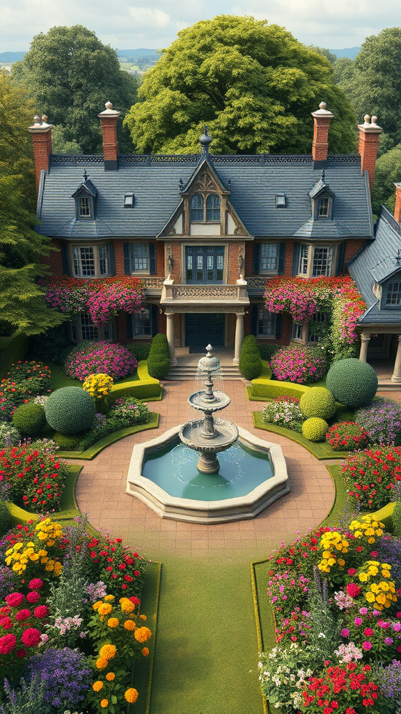 A stunning masterpiece of an old manor featuring a magnificent garden with a central fountain, surrounded by a vibrant array of colorful flowers and majestic trees. The scene is captured in isometric 3D, utilizing octane render and ray tracing for a super detailed and life-like representation, exuding charm and elegance in every detail.