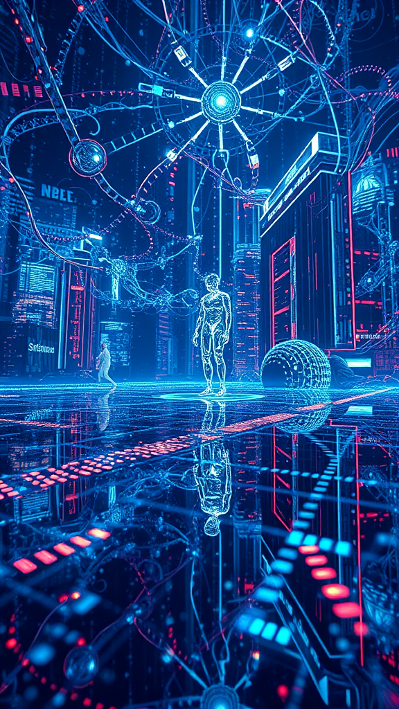 A stunning masterpiece of digital art blending hologram effects with vast streams of big data, forming a high-tech digital landscape. The intricate design features dynamic sound waves pulsating through an advanced neural network, incorporating the presence of a futuristic humanoid. Enchanting reflections dance across the scene, captured in exquisite detail with 32k UHD resolution, showcasing the epitome of high-quality professional photography in an awe-inspiring close-up view.
