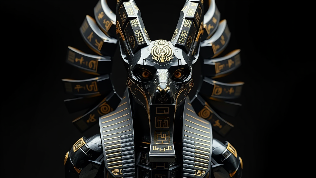 A stunning masterpiece sculpture of Anubis, reimagined as a futuristic "God of Death" in an avant-Egyptian style. The monumental figure exudes complexity and a forward-looking aesthetic, crafted from black granite with an ultra-smooth finish interlaced with intricate gold inlays. The design is modular with sacred hieroglyphs seamlessly integrated into the structure. Set against a dark backdrop, dim Egyptian symbology is projected in light, enhancing the grand and sober presence. The portrait capture is centered, bringing into focus a laser-cut precision with hyper-detail, embodying a sci-fi, futuristic-avant-Egyptian vision.